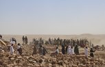 Image: CARE staff distribute water bottles to people displaced by the conflict amid a very severe shortage of drinking water.